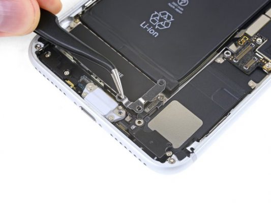 پیچ 3.5 میلیمتری که در عکس با رنگ زرد مشخص شده را هم از کنار موتور ویبراتور آیفون باز کنید.