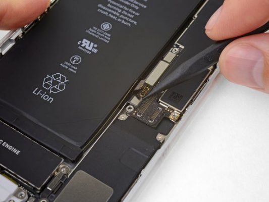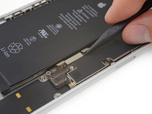 نکته: سیم و کانکتور باتری آیفون 8 پلاس اپل را تا حد امکان از سوکتش دور کنید تا اتفاقی با آن برخورد نداشته باشد و منجر به ایجاد اتصال کوتاه (انتقال انرژی ناخواسته) نشود.