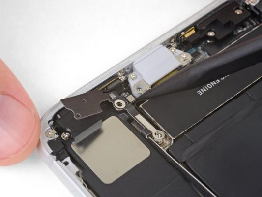 با نوک اسپاتول سرگرد کانکتور موتور ویبره یا ویبراتور آیفون 8 پلاس را از روی سوکتش آزاد کنید.