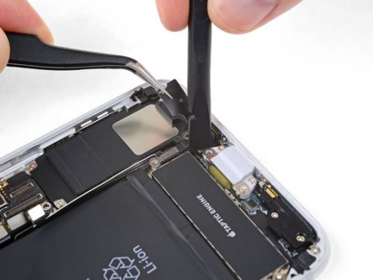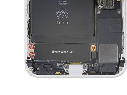 پیچ 1.3 میلیمتری که در عکس با رنگ قرمز مشخص شده را از گوشه موتور ویبراتور آیفون 8 پلاس باز کنید.