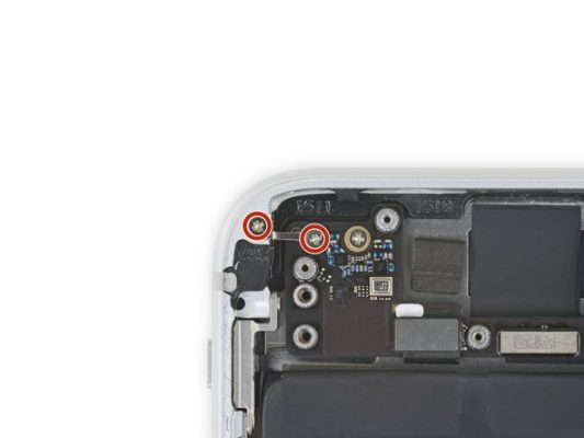 پیچ 1.3 میلیمتری که در داخل لبه فوقانی قاب آیفون 8 پلاس تعمیری نصب است و در عکس با رنگ قرمز مشخص شده را باز کنید.