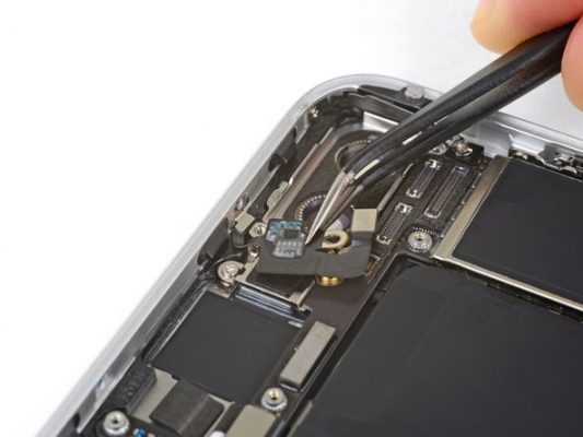 به آرامی با نوک اسپاتول کانکتور سنسورهای جلوی آیفون 8 پلاس تعمیری را از روی برد گوشی باز کنید.