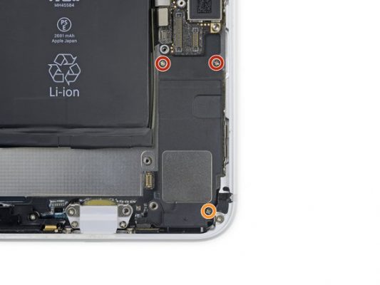 دو پیچ 1.2 میلیمتری که در عکس با رنگ قرمز مشخص شدهاند را از گوشه قاب iPhone 8 Plus باز کنید.